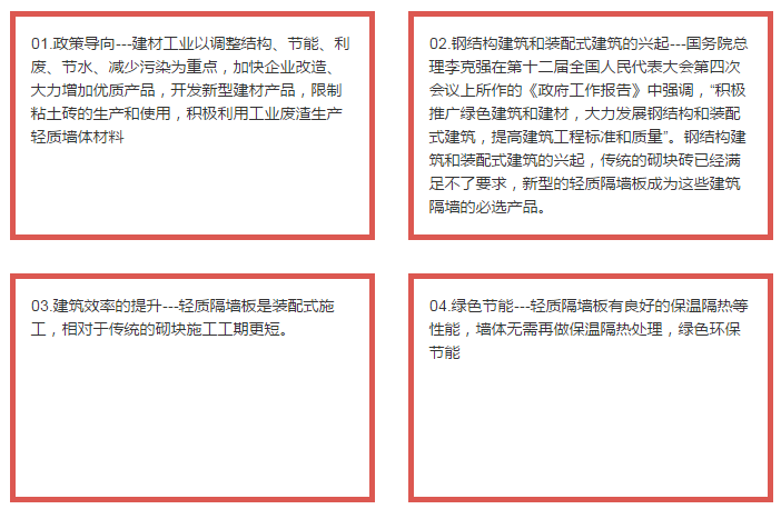 按照國家十三五規劃,至2020年,我國裝配式建筑要占全部建筑中的比重不低于30%,那么,在未來五年,新型裝配式墻體材料及相關產品將有幾十倍的增長。《國家"九五"計劃與2010年國家經濟發展鋼要》再次強調"建材工業以調整結構、節能、利廢、節水、減少污染為重點,加快企業改造、大力增加優質產品,開發新型建材產品,限制粘土磚的生產和使用,積極利用工業廢渣生產輕質墻體材料"。